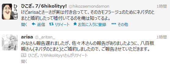 ・arisaがネバダのとまとと婚約したことをツイッターで発表。