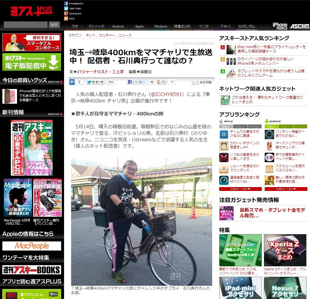・石川典行のママチャリ旅が週間アスキーの電子版で取り上げられる