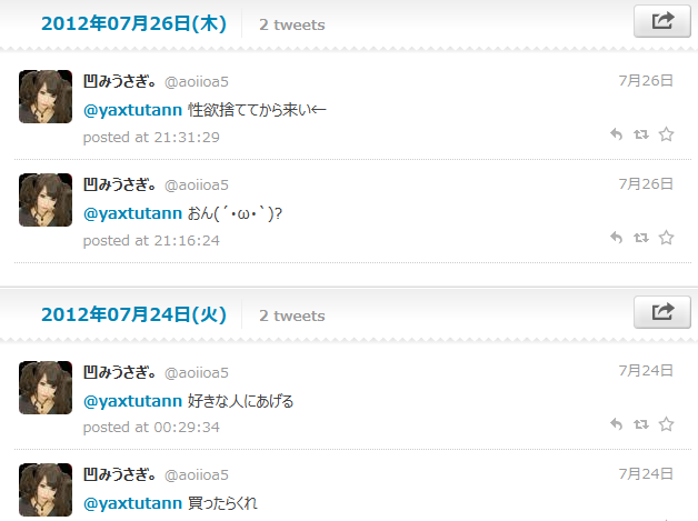 他にも見たい方はこちらからどうぞ http://twilog.org/aoiioa5/friends-yaxtutann