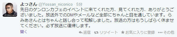 ・よっさんがらみあとも和解したこととをツイートで明言し、放送復帰を示唆。