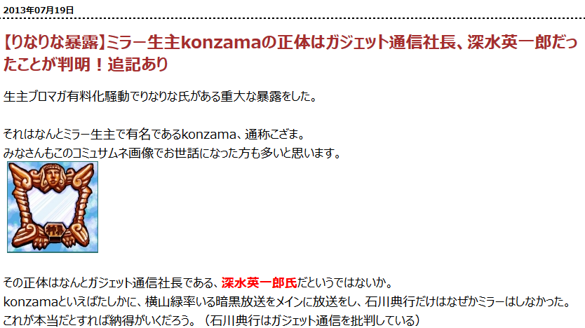 【りなりな暴露】ミラー生主konzamaの正体はガジェット通信社長
