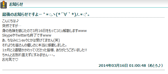 ・第二の藍上と言われていた、めとろが「身の危険を感じたので3月16日にコミュ解散します」と引退宣言。