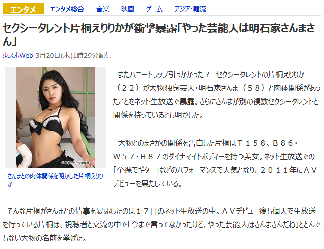 ・3/18の片桐えりりかが、明石家さんまとセックスしたのを暴露配信した記事がヤフーニュースに取り上げられる。