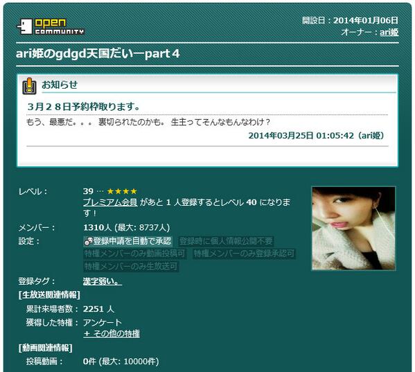 ari姫は「裏切られたと」3/28に予約枠を取り、3ヶ月ぶり3回目の「淫行暴露」祭りの開催を告げる。