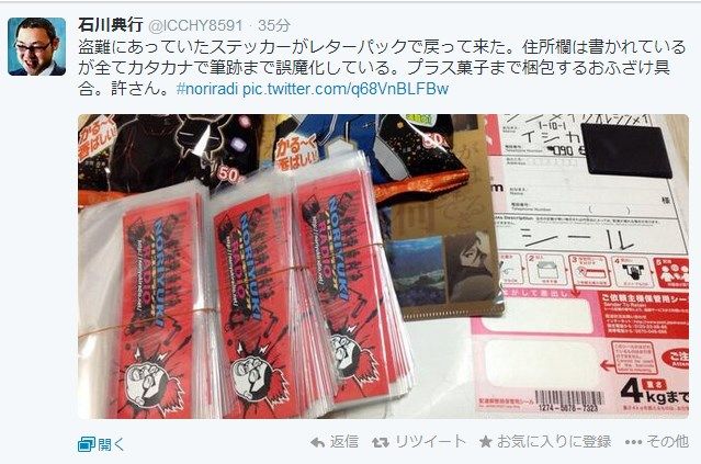 ・盗難にあった自身のステッカーがお菓子付きで郵送返却され石川典行が激怒
