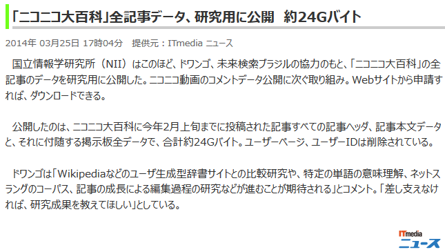 ・ニコニコ大百科の全記事データ24Gバイト分を研究用に公開。