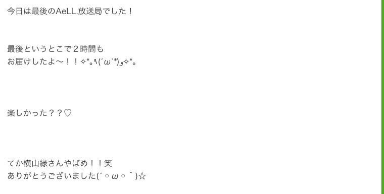 ・横山緑が篠崎愛が所属するアイドルグループ「Aell.」の公式放送最終回に出演。