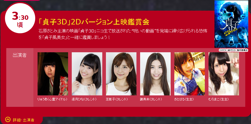 ・むらまこが公式23時間生放送03:30~の「貞子3D上映会」にタレント、アイドルらと共に出演。