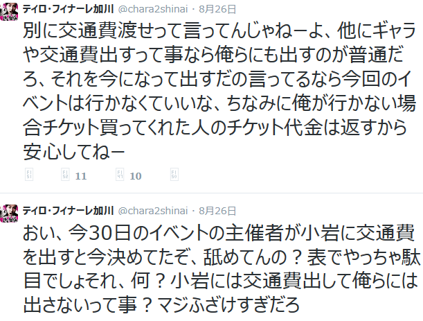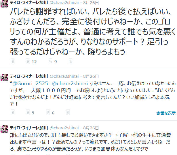 ・ティロフィナーレ加川が、今月末に行なわれる生主イベントに関して、特定の生主だけ交通費が