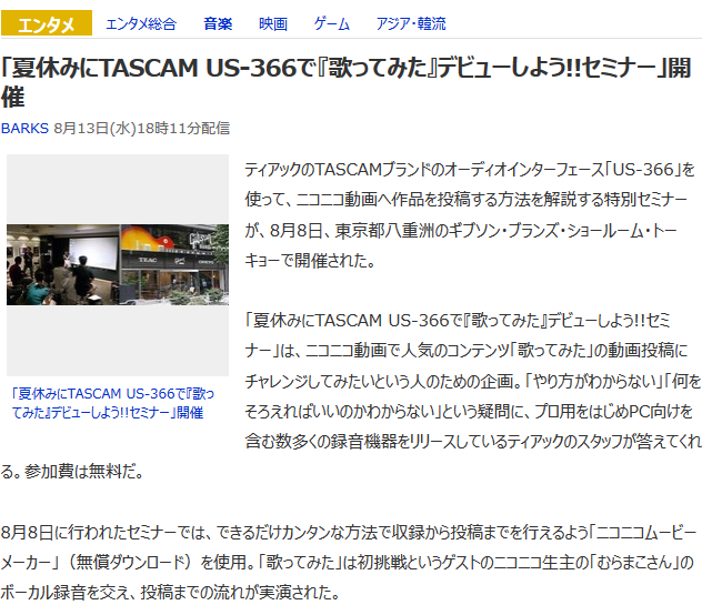 ・むらまこが出演した「TASCAM US-366で歌ってみたデビューしよう」イベントがyahooニュースに掲載される。