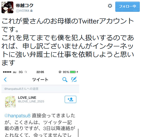 ▼母親のツイッターアカウントが帝越コクが犯人であることを否定。