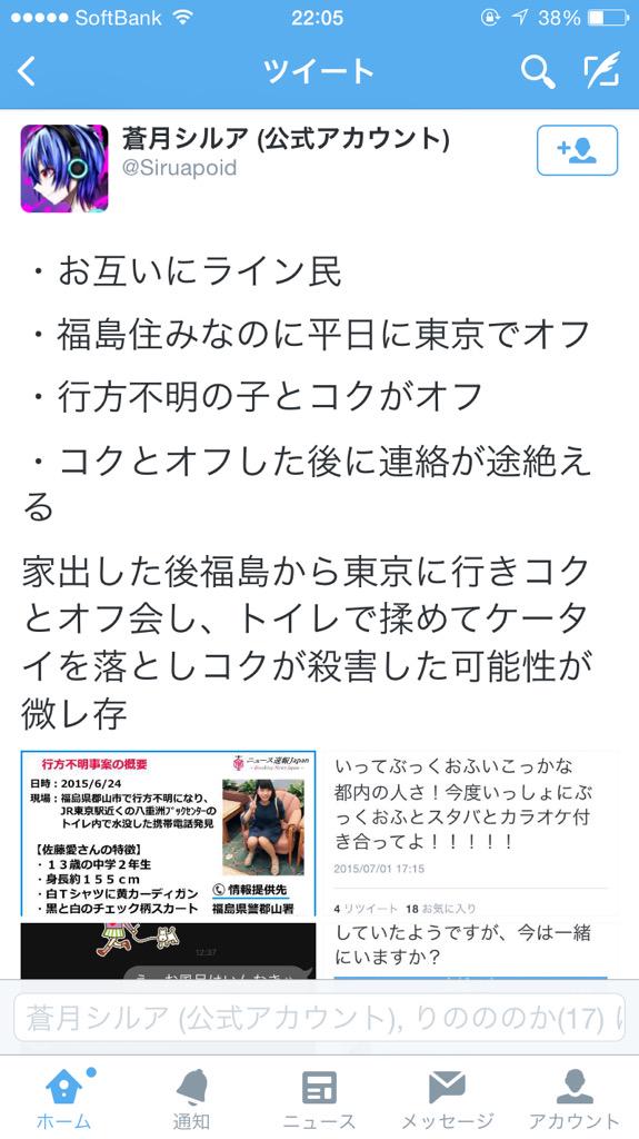 ん…?犯人が佐藤愛さんを殺害後ケータイでこのツイッターアカウントを作りコクと会う約束をLINEでしてコクを犯人に仕立て上げてからケータイをトイレに捨てた可能性が微レ存…? pic.twitter.com/qW3UDHzhwO