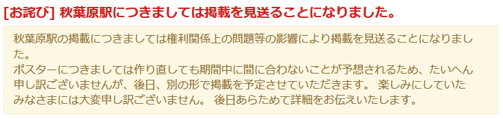 そのなかで秋葉原駅のポスターがわずか半日も経たないうちに撤去された。