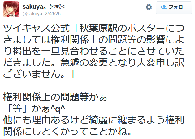 ツイキャス運営は、問題の秋葉原駅に設置していたポスターをわずか半日で撤去するに