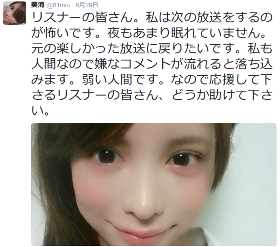 業者だと疑うアンチリスナーのコメントに対し、美海が「コメントが怖くて放送できない」とツイート。