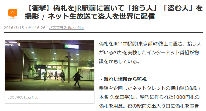 ・横山緑が「JR駅前に置いて偽札を置いて誰か拾うか」配信がニコニコニュースに。