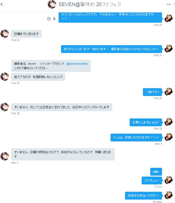 2/12日に約束していた撮影データを渡されず、再度催促したケーキ姫をブロックし、逆に脅迫しているという。