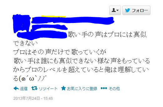 【2chまとめ】ニコニコ動画の歌い手の曲初めて聞いたんだけどさ 2013年08月29日 カテゴリ:2chまとめ歌い手・ボカロP mixiチェック 1: 以下、名無しにかわりましてVIPがお送りします 2013/08/29(木) 04:25:22.20 ID:ZGF8fZzB0 キーが原曲の奴がほとんどいなくてびっくりした、こんなもん誰でもかっこいい声で歌えるやん 【【2chまとめ】ニコニコ動画の歌い手の曲初めて聞いたんだけどさ】の続きを読む